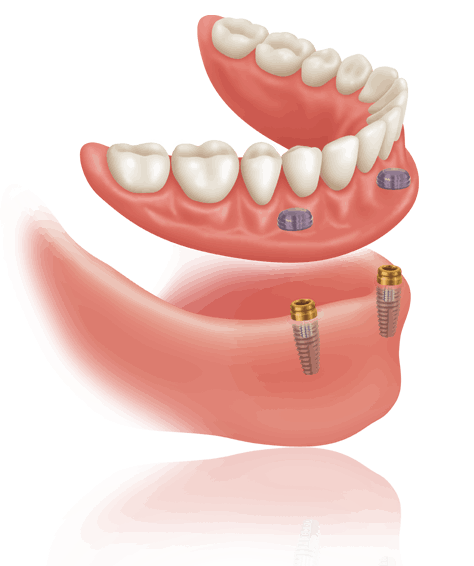 Hierbij worden 2 of meer implataten in een kaak geplaatst waarboven de tandarts een prothese die ‘vastklikt’ kan maken of zelfs een volledige tandenboog kan vastschroeven op deze implantaten.